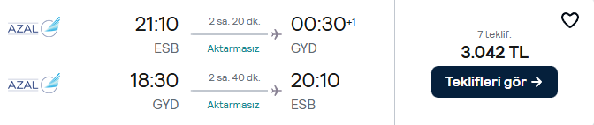 Azerbaycan’a uygun fiyatlı bir yolculuk planlayanlar için kaçırılmayacak bir fırsat! Ankara – Bakü uçuşları, Şubat ayında 3.000 TL‘den başlayan fiyatlarla. En uygun tarihler aşağıda 👇