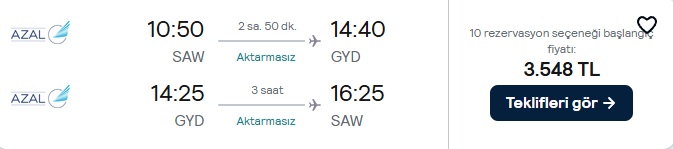 Azerbaycan’a uygun fiyatlı bir yolculuk planlayanlar için kaçırılmayacak bir fırsat! İstanbul – Bakü uçuşları, Mart ayında 3.500 TL‘den başlayan fiyatlarla. En uygun tarihler aşağıda 👇
