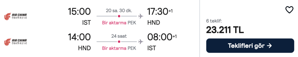 ⚠️ KRİTİK UYARI: Air China, son aylarda Japonya uçuşlarında operasyonel kaynaklı sık iptaller yapabiliyor. Bilet fiyatı çok avantajlı ancak bu riski bilerek almanızı, otel rezervasyonlarınızı mutlaka “ücretsiz iptal edilebilir” seçeneğiyle yapmanızı öneririm.