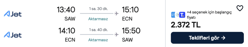 İstanbul – Kıbrıs Uçak Bileti 2.400 TL