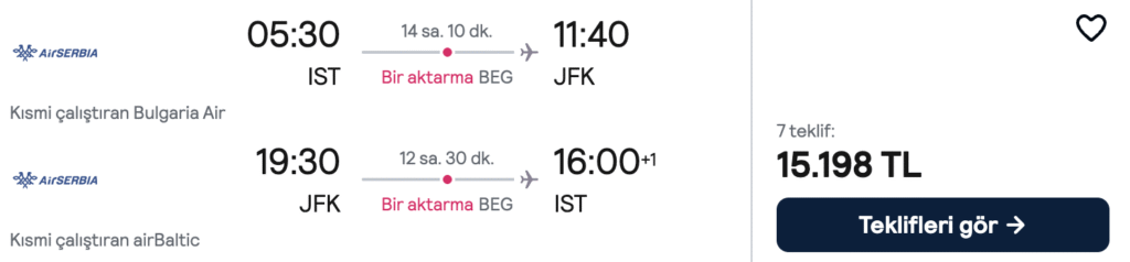 Amerika’nın kalbi New York’a ekonomik bir yolculuk planlıyorsan, bu fırsatı kaçırma! Air Serbia ile İstanbul’dan New York’a 15.200 TL’den başlayan fiyatlarla biletini hemen rezerve edebilirsin.