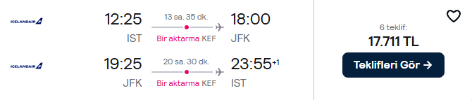 Amerika’nın kalbi New York’a ekonomik bir yolculuk planlıyorsan, bu fırsatı kaçırma! Icelandair ile İstanbul’dan New York’a 17.700 TL’den başlayan fiyatlarla biletini hemen rezerve edebilirsin.