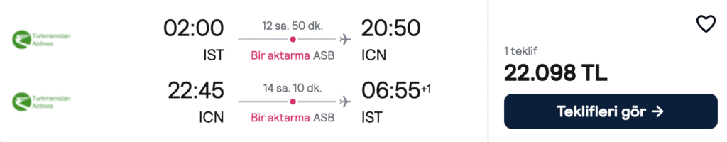 Güney Kore’ye uygun fiyatlı bir yolculuk planlayanlar için kaçırılmayacak bir fırsat! İstanbul – Seul uçuşları 22.100 TL’den başlayan fiyatlarla. En uygun tarihler aşağıda 👇