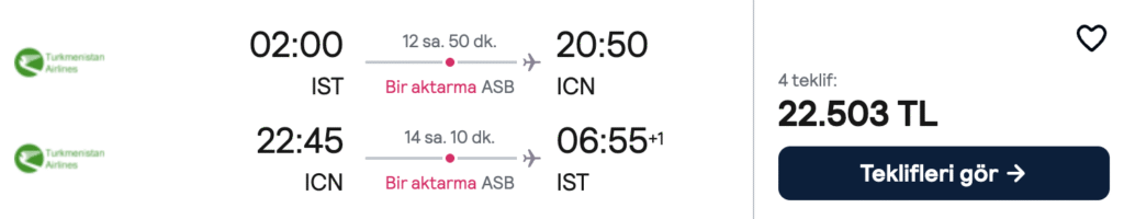 Güney Kore’ye uygun fiyatlı bir yolculuk planlayanlar için kaçırılmayacak bir fırsat! İstanbul – Seul uçuşları 22.400 TL’den başlayan fiyatlarla. En uygun tarihler aşağıda 👇